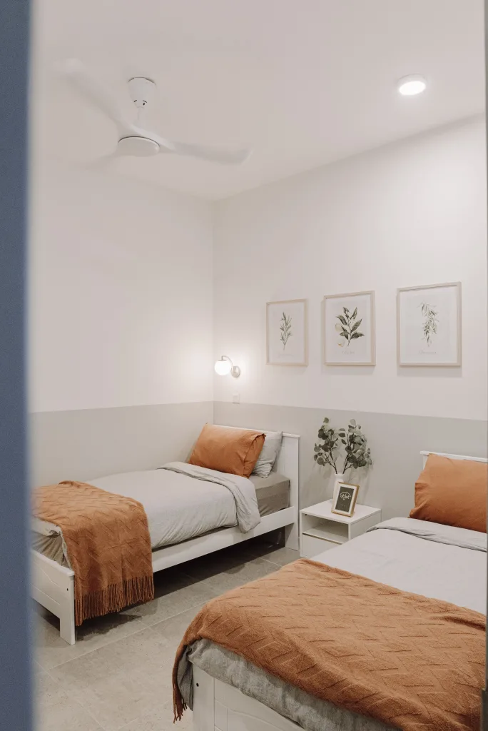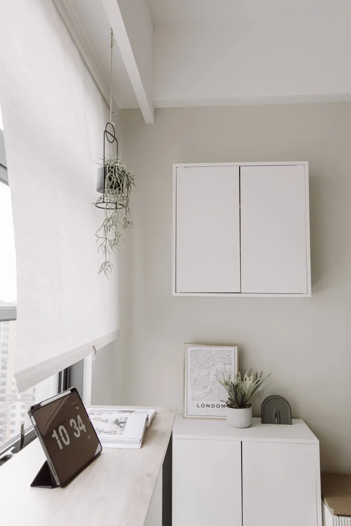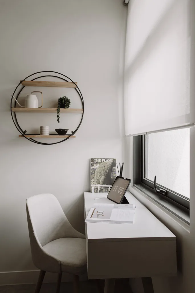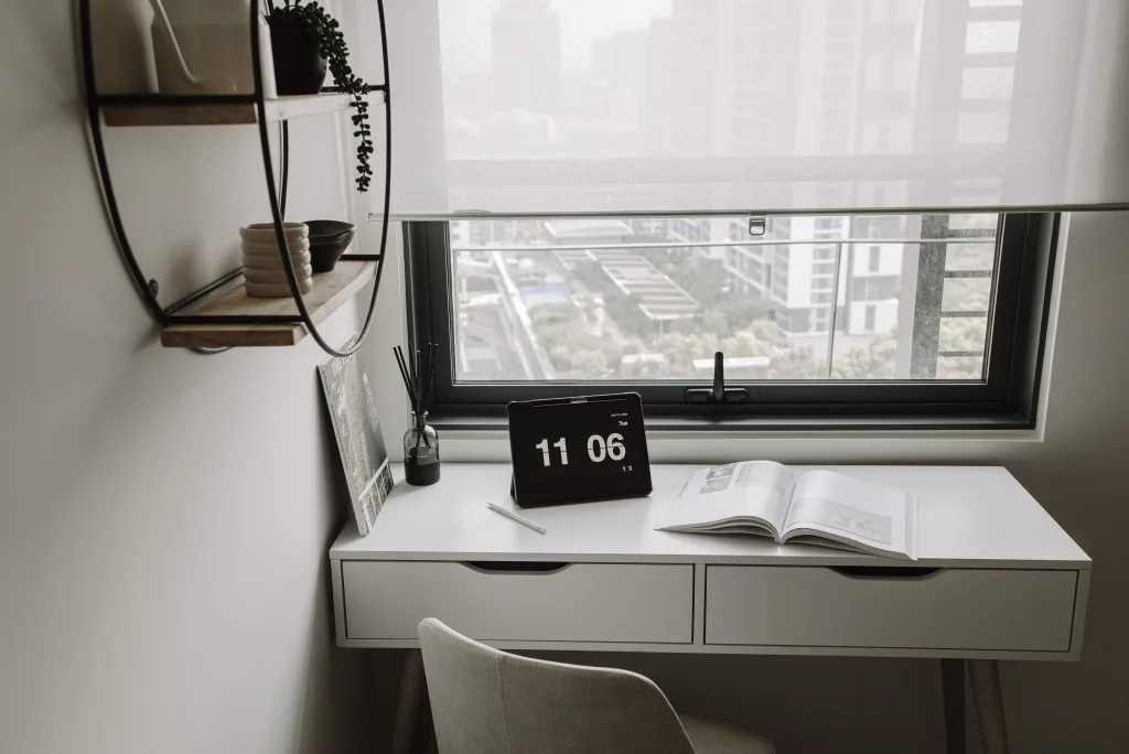 This multifunctional living space in Sunway is designed to optimize every inch of the room, creating a perfect blend of work and relaxation for students. The living hall doubles as a workstation nook, with clever storage solutions nestled next to the window, ensuring the space remains clutter-free and functional. The light, airy design allows for productivity during the day, with natural light streaming in through the window, while also providing a relaxing environment when the workday is done.