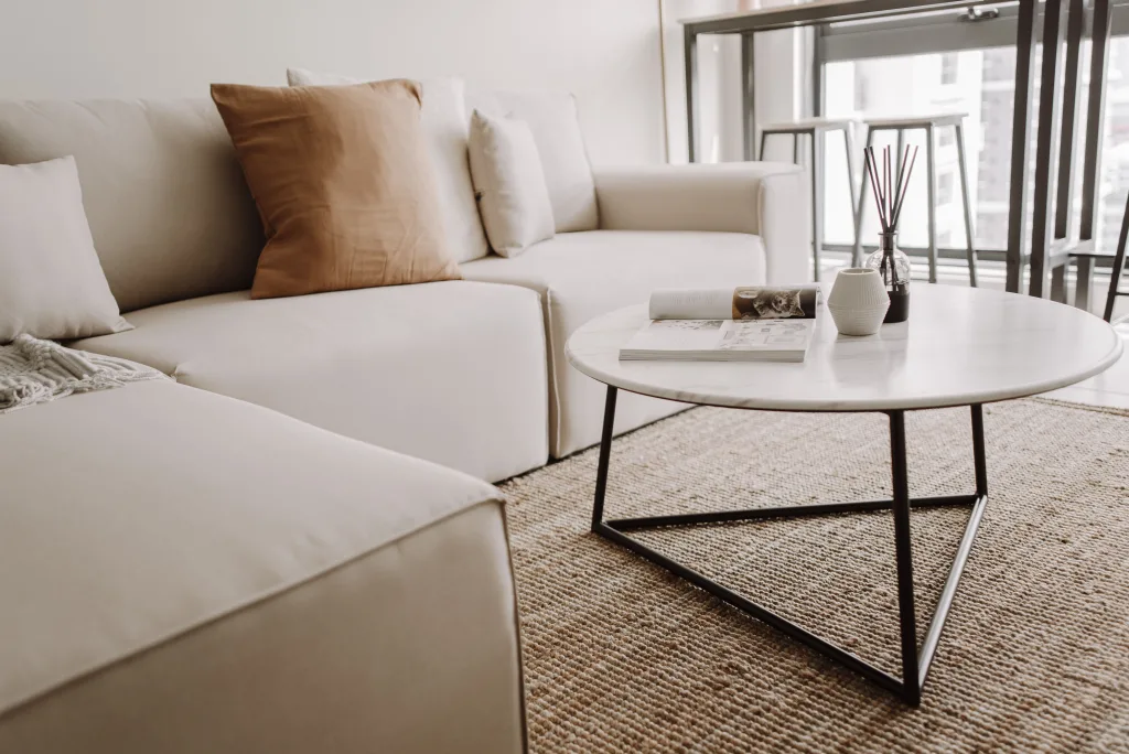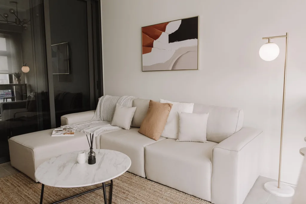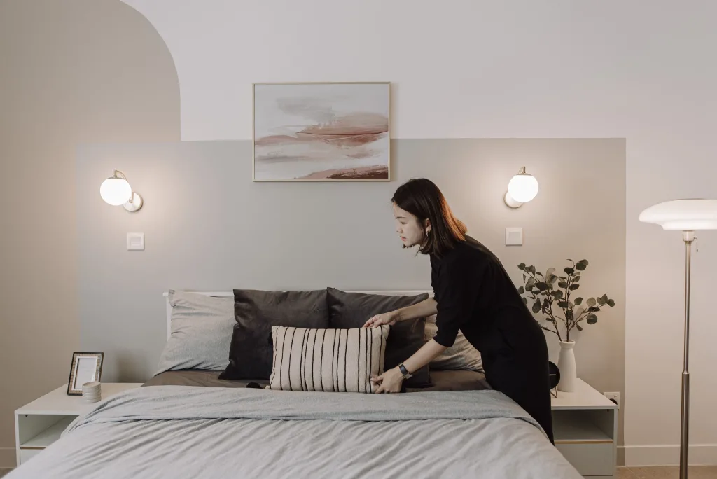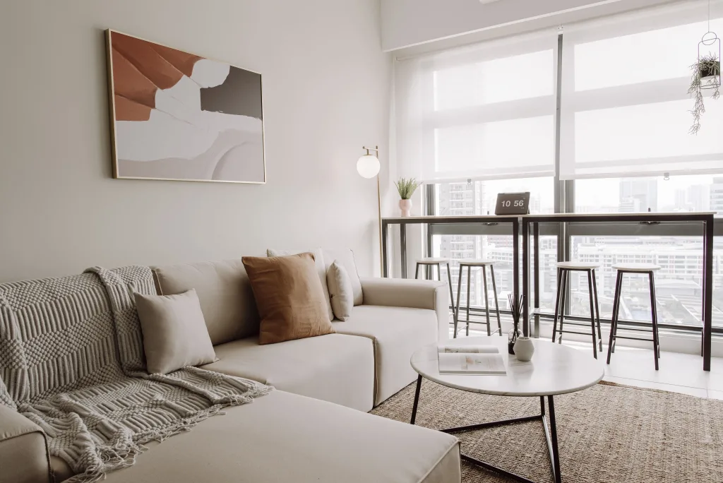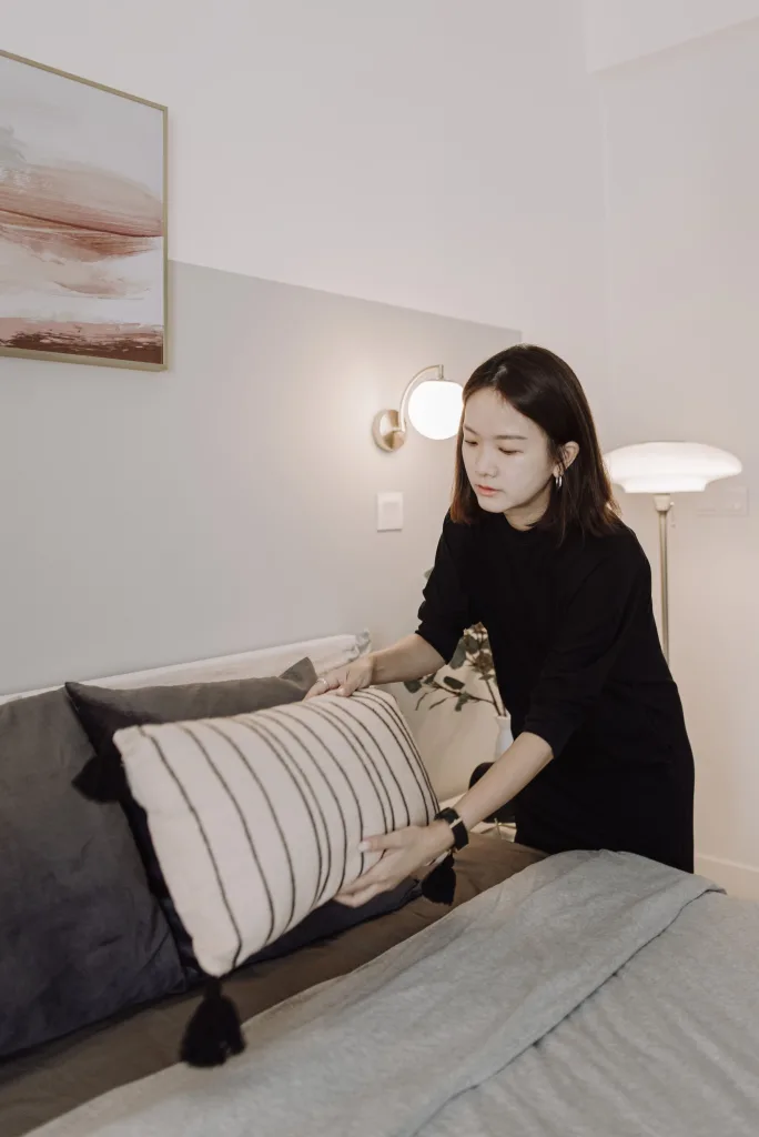 This multifunctional living space in Sunway is designed to optimize every inch of the room, creating a perfect blend of work and relaxation for students. The living hall doubles as a workstation nook, with clever storage solutions nestled next to the window, ensuring the space remains clutter-free and functional. The light, airy design allows for productivity during the day, with natural light streaming in through the window, while also providing a relaxing environment when the workday is done.